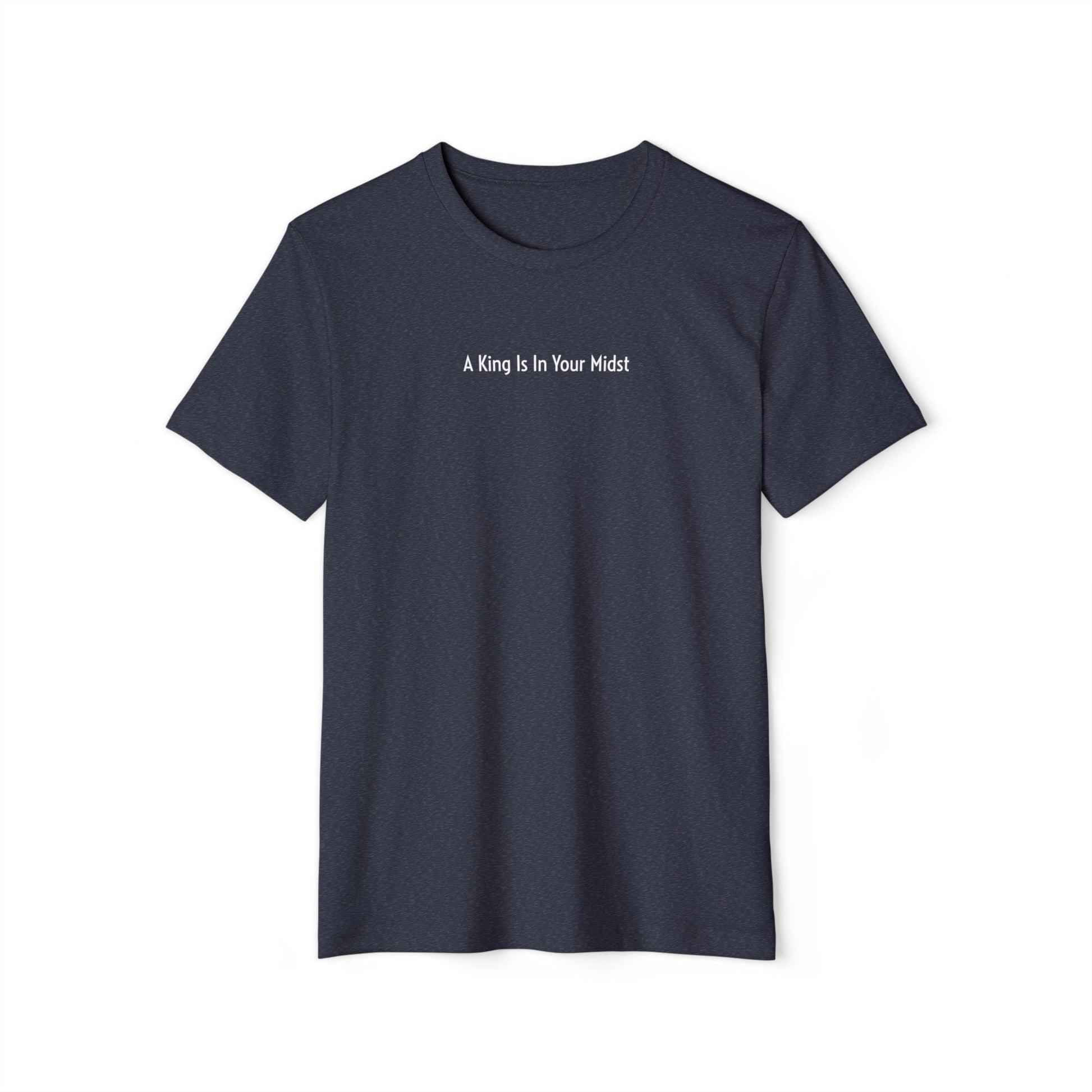 A King Is In Your Midst™ (A Collection of Kissed By The Earth™) Recycled Organic T-Shirt - White on Heather Navy (1st Edition)
